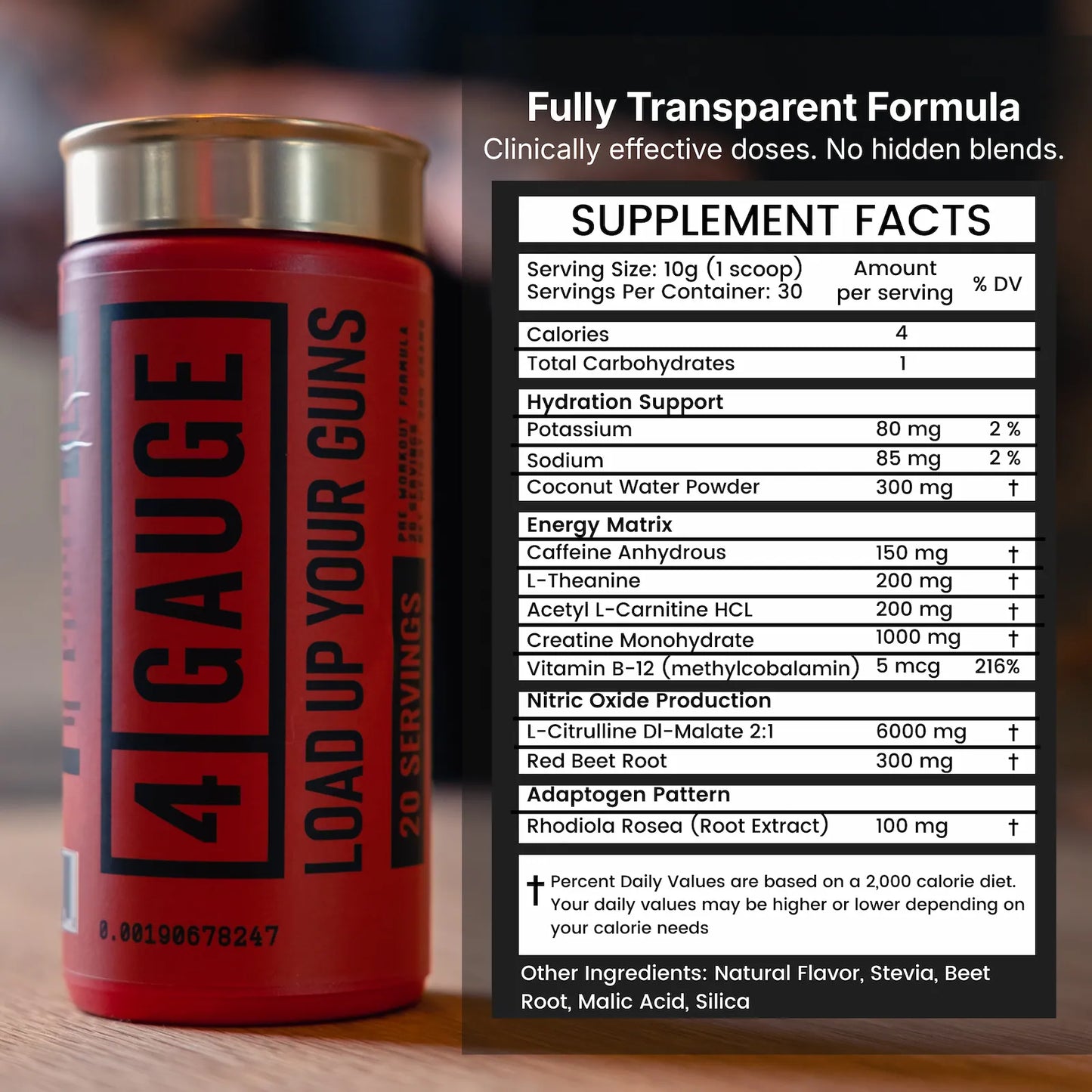 4 Gauge is built with long-term performance in mind. It avoids excessive stimulants, artificial sweeteners, and proprietary blends. The formula focuses on proven ingredients at responsible doses so you can train hard without beating up your nervous system. Healthy performance isn't about spikes. It's about sustainability.